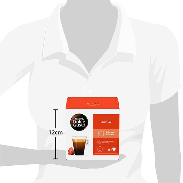 Открий NESCAFÉ® Dolce Gusto Lungo - дълго кафе (120 ml) от средно изпечени кафе зърна, със силен аромат и копринен каймак. Наслади се на тази чаша дълго кафе със силни ароматни нотки на печени кафе зърна и деликатни нотки на касис. EXTRA CREMA=съвършен каймак. Интензитет 6. Печено мляно кафе 100% Арабика с произход Колумбия, Бразилия и Етиопия.Lungo, 16 броя