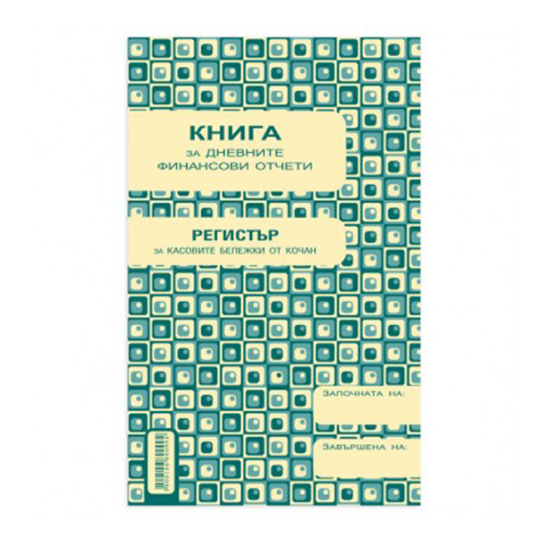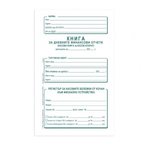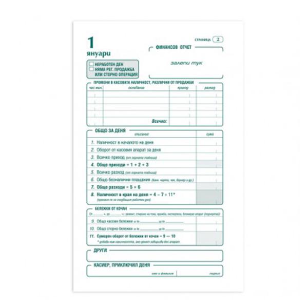 Книга за дневните финансови отчети от касовия апарат, мека подвързия, вестникарска хартия, формат А5, размери 13 х 20 см, 185 листа.