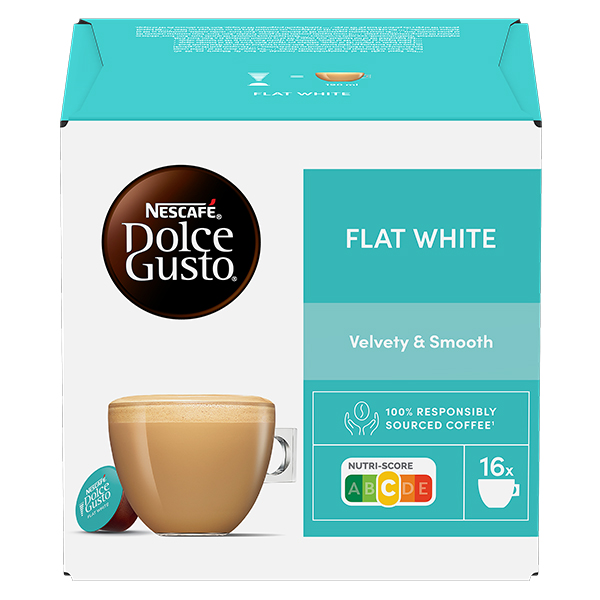 Открий NESCAFE® Dolce Gusto Flat White - млечна кафе напитка в една капсула, вдъхновена от баристите в Австралия, с кремообразна кадифена текстура и изтънчена сладост. Кафе Арабика и Робуста. Препоръчителна дължина на напитката: 180 ml Открий NESCAFE® Dolce Gusto Flat White - млечна кафе напитка в една капсула, вдъхновена от баристите в Австралия, с кремообразна текстура на кадифена и изтънчена сладост. Кафе Арабика и Робуста. Препоръчителна дължина на напитката: 180 ml Включи кафемашината ти в електрическата мрежа, натисни бутона за включване, изчакай бутонът да светне в зелено. Постави чаша в кафемашината. Постави капсулата в кафешината.За ръчна кафемашина:Премести лостчето надясно (обозначено в червен цвят за топла напитка) и изчакай дължината на напитката да достигне 180 ml. За автоматична кафемашина: Избери 6 чертички от скалата и стартовата машина за топла напитка