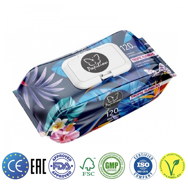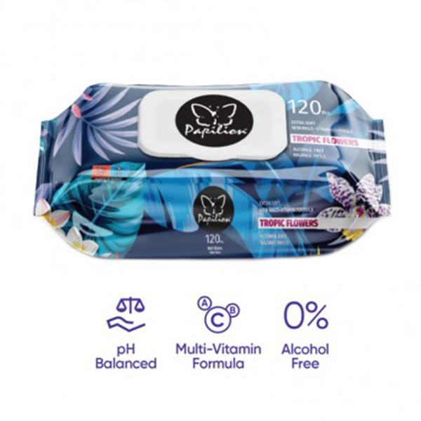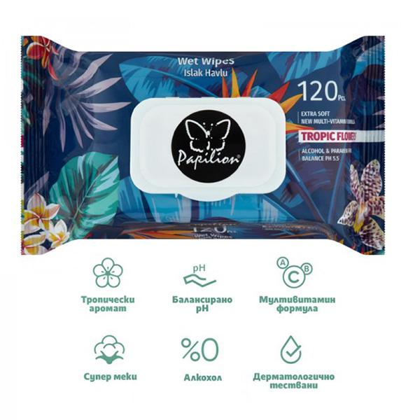 Мокри кърпи Papilion Tropic Flower притежават иновативна мултивитамин формула без алкохол с балансирано pH, като старателно почистват, без да изсушават кожата, осигурявайки надеждна антибактериална защита.