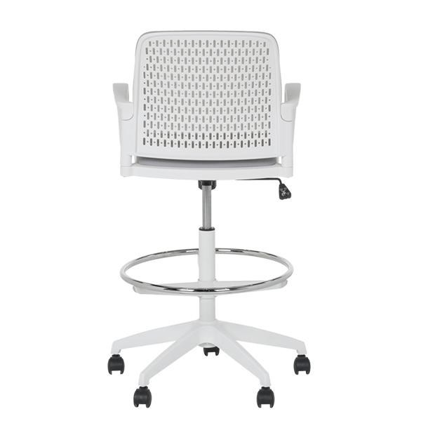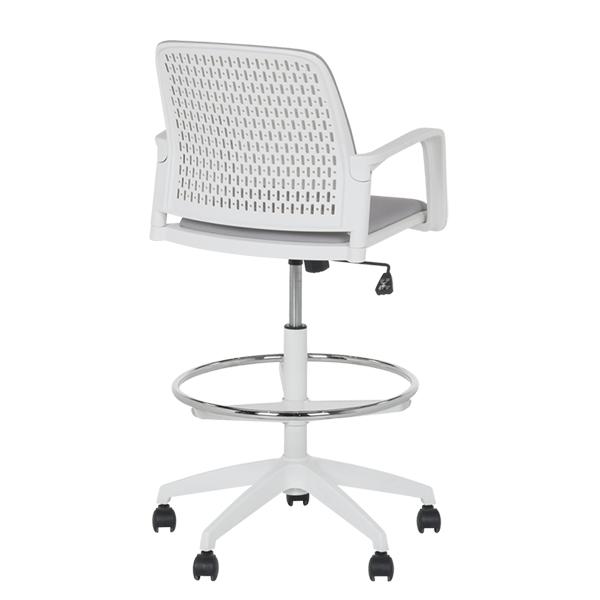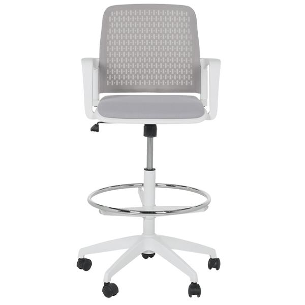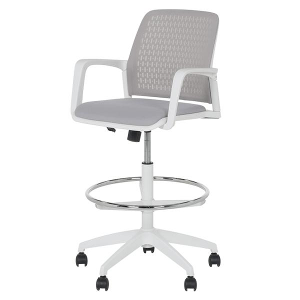 Работен офис стол 7556 комбинира функционалност и комфорт. Благодарение на регулируемата си височина и хромирана степенка тип ринг, той може да се използва както като обикновен офис стол, така и като висок работен стол. Степенката осигурява удобна опора за краката и предпазва от неприятното усещане за „висящи“ крака при по-висока позиция на седалката. Седалката е тапицирана с дамаска, а облегалката е изработена от полипропилен с мрежеста структура за по-добра вентилация и циркулация на въздуха
