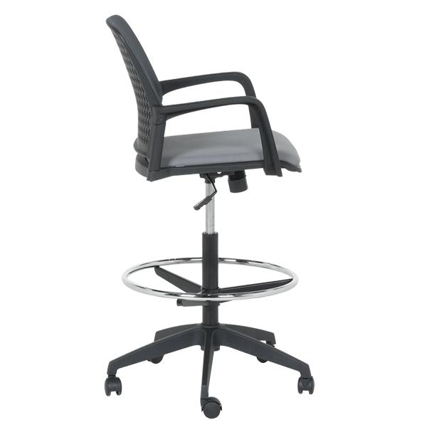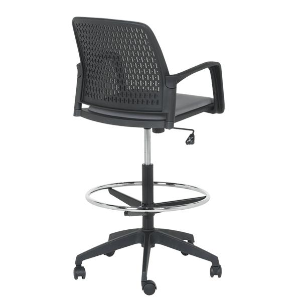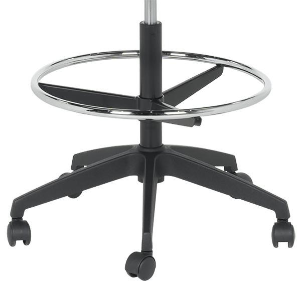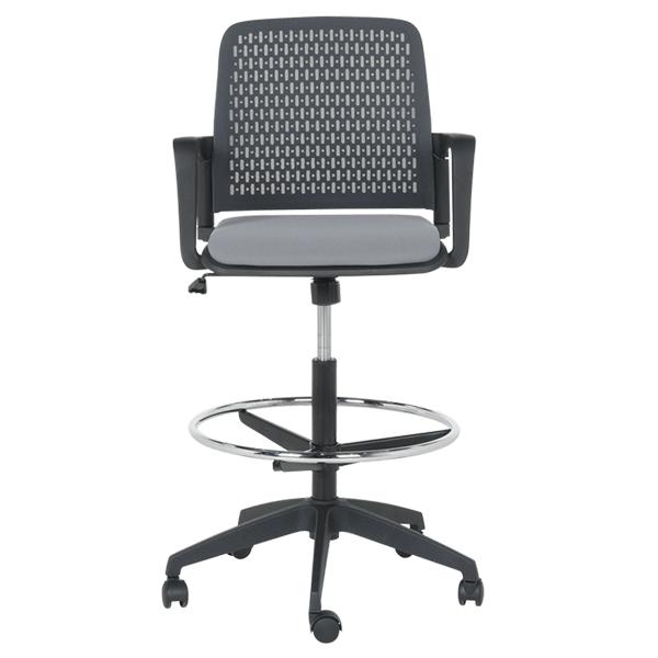 Работен офис стол 7556 комбинира функционалност и комфорт. Благодарение на регулируемата си височина и хромирана степенка тип ринг, той може да се използва както като обикновен офис стол, така и като висок работен стол. Степенката осигурява удобна опора за краката и предпазва от неприятното усещане за „висящи“ крака при по-висока позиция на седалката. Седалката е тапицирана с дамаска, а облегалката е изработена от полипропилен с мрежеста структура за по-добра вентилация и циркулация на въздуха