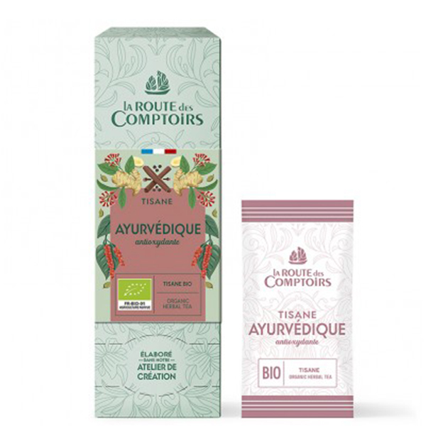 Здравословен Био Билков чай - Аюрведичен Антиоксидант представлява балансирана смес от подправки: цейлонска канела, джинджифил, черен пипер, кардамон и карамфил. Пикантните ѝ нотки създават успокояваща и топла чаша — идеална за момент на благополучие и вътрешен комфорт.
